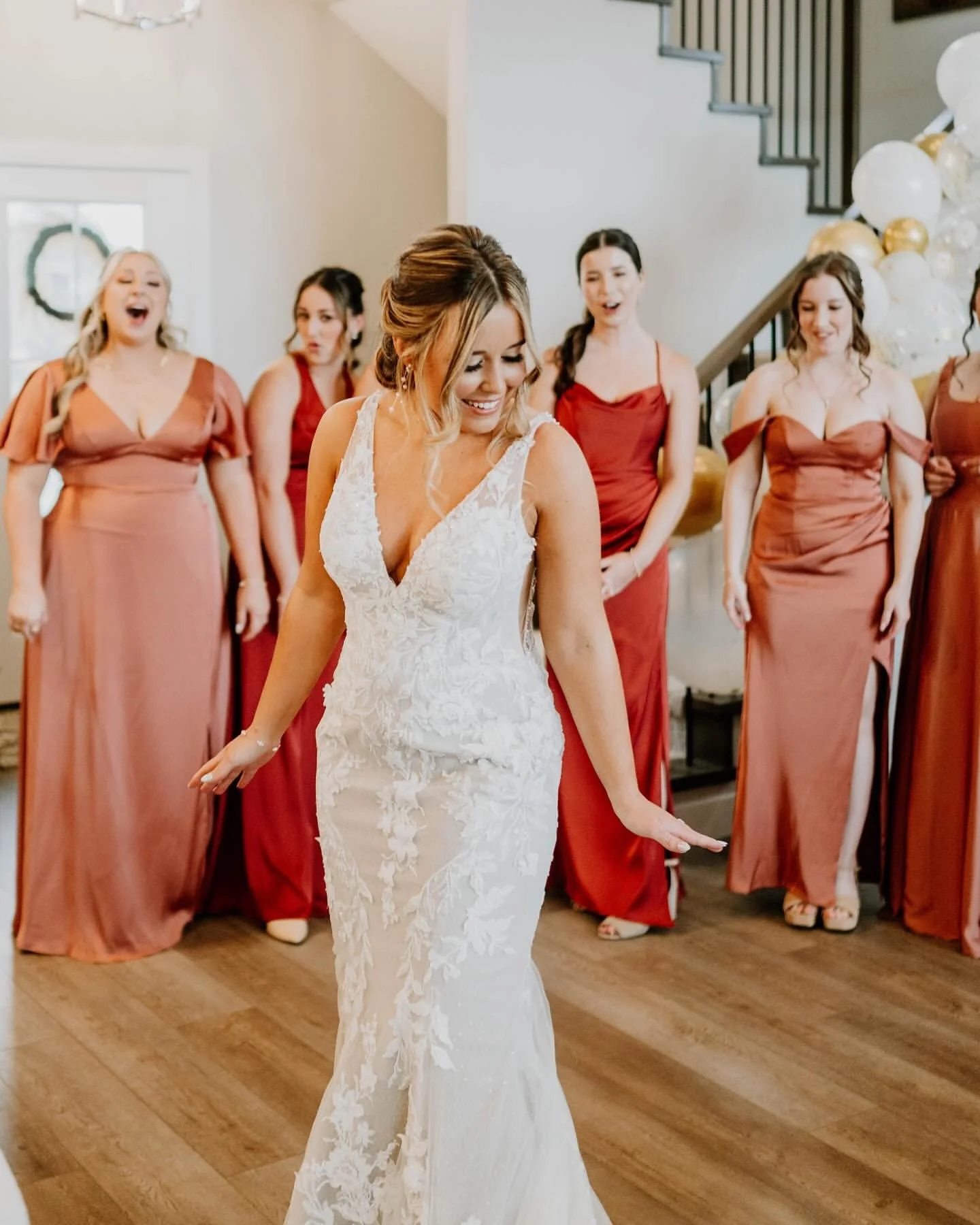 A group of eight bridesmaids all in different styles of burgundy dresses smiling and clapping inside a house, with a fireplace and furniture in the background. They're staring up at a bride as she makes her first appearance at the top of the stairs.