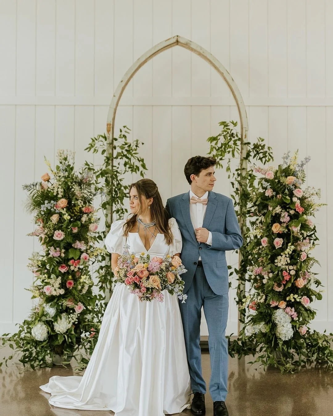 A bride and groom standing in front of a floral wedding arch with greenery and pink and white roses, inside a white room with vertical paneling.