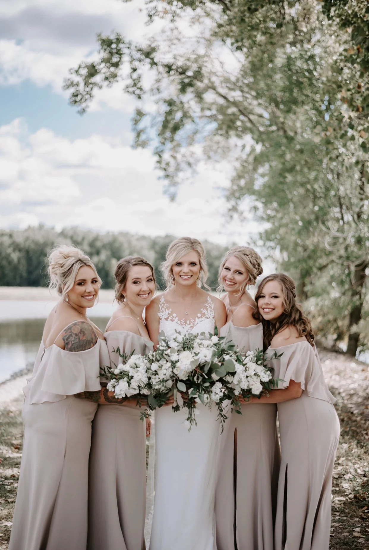 A bride wearing a white wedding gown and four bridesmaids wearing beige bridesmaid dresses, standing outside by a lake, all holding bouquets of white flowers with greenery, smiling.