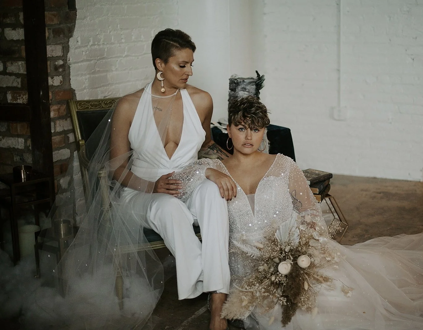 Two women in wedding dresses seated indoors against a brick and white wall, with one woman sitting on the floor holding a bouquet of dried flowers and the other sitting on a chair looking at her.