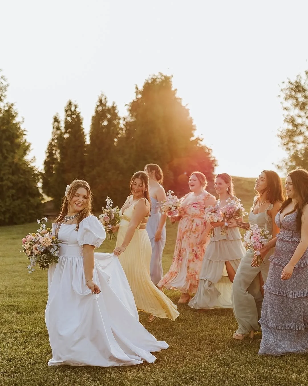Group of bridesmaids in colorful dresses holding bouquets walking behind a bride on a grassy field during sunset.