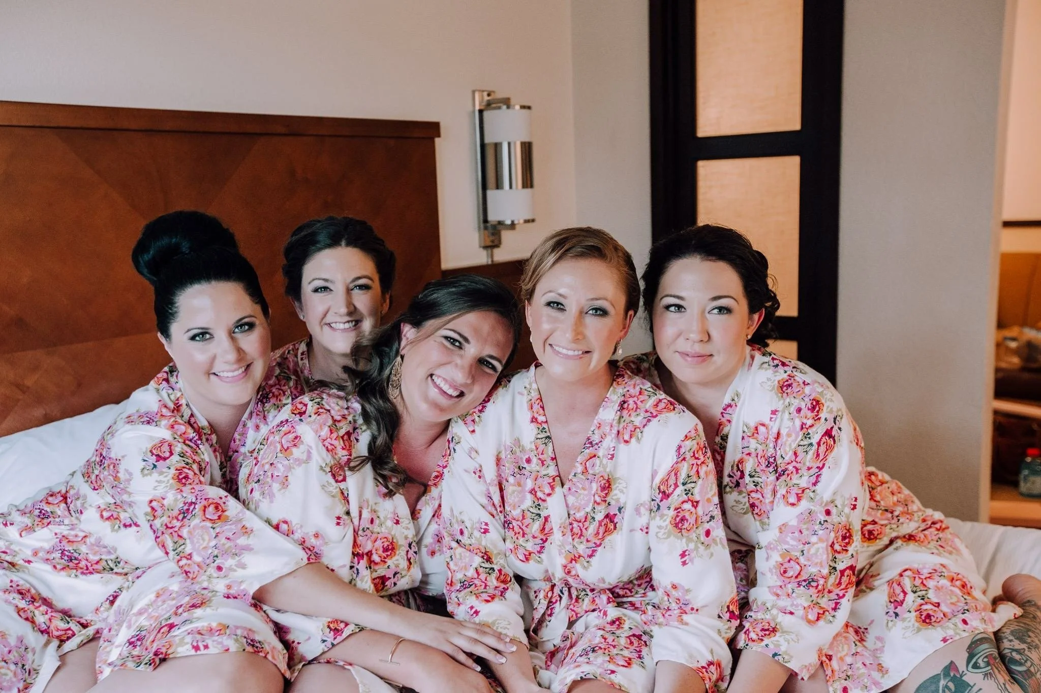 A bride and four bridesmaids in floral robes sitting on a bed, smiling and getting ready before the wedding.